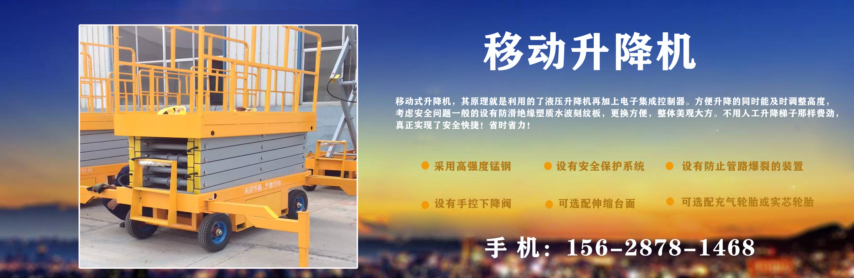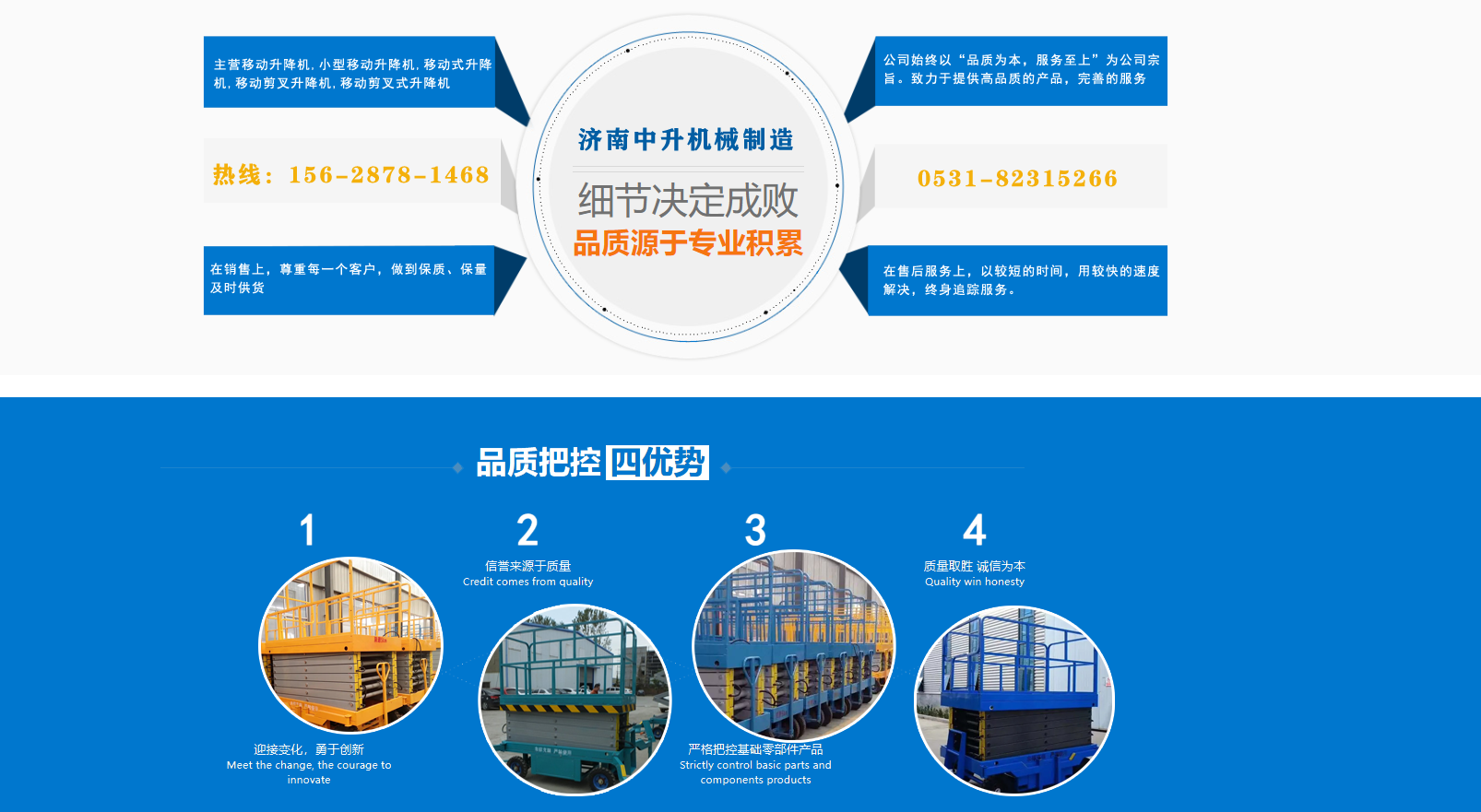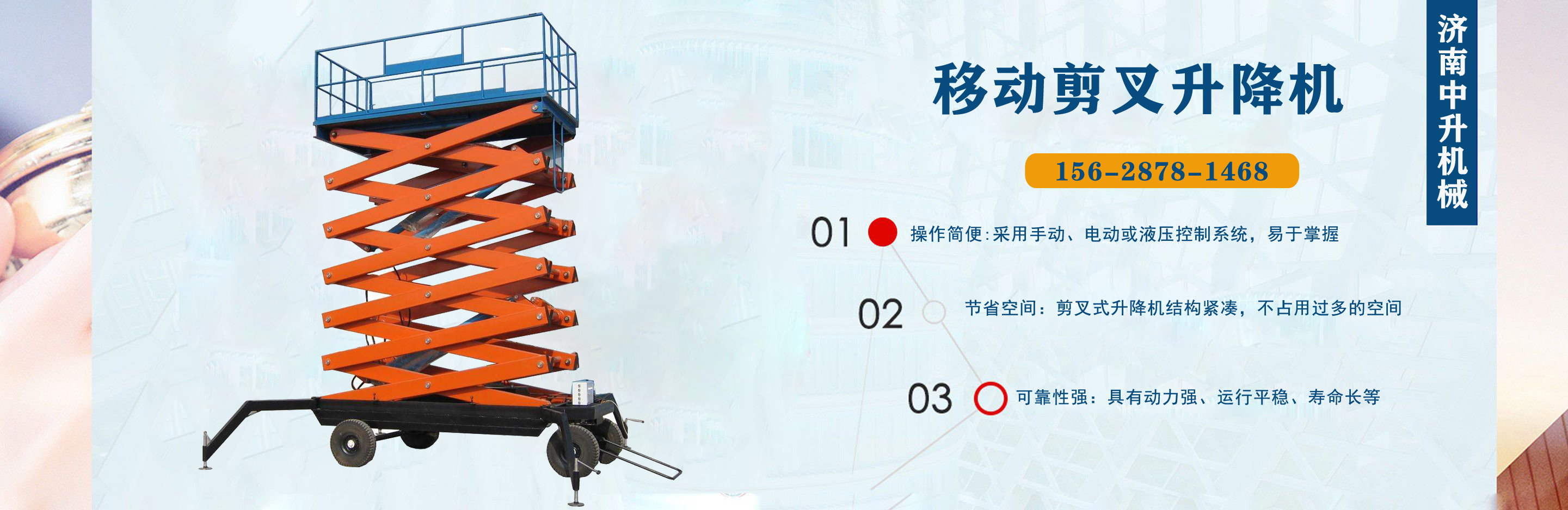 濟(jì)南中升機(jī)械制造有限公司主營(yíng)移動(dòng)升降機(jī),小型移動(dòng)升降機(jī),移動(dòng)式升降機(jī),移動(dòng)剪叉升降機(jī),移動(dòng)剪叉式升降機(jī)等產(chǎn)品,信譽(yù)良好,歡迎前來(lái)咨詢訂購(gòu)! 在銷售上,尊重每一個(gè)客戶,做到保質(zhì)、保量及時(shí)供貨;在售后服務(wù)上,以較短的時(shí)間,用較快的速度解決,終身追蹤服務(wù)。 公司始終以“品質(zhì)為本,服務(wù)至上”為公司宗旨。致力于提供高品質(zhì)的產(chǎn)品,完善的服務(wù),快捷的供貨,無(wú)論您身處何方,都能感受到我們的優(yōu)良服務(wù)。客戶至上,誠(chéng)信為本。 歡迎各界朋友來(lái)電,來(lái)函垂詢,選購(gòu)!...